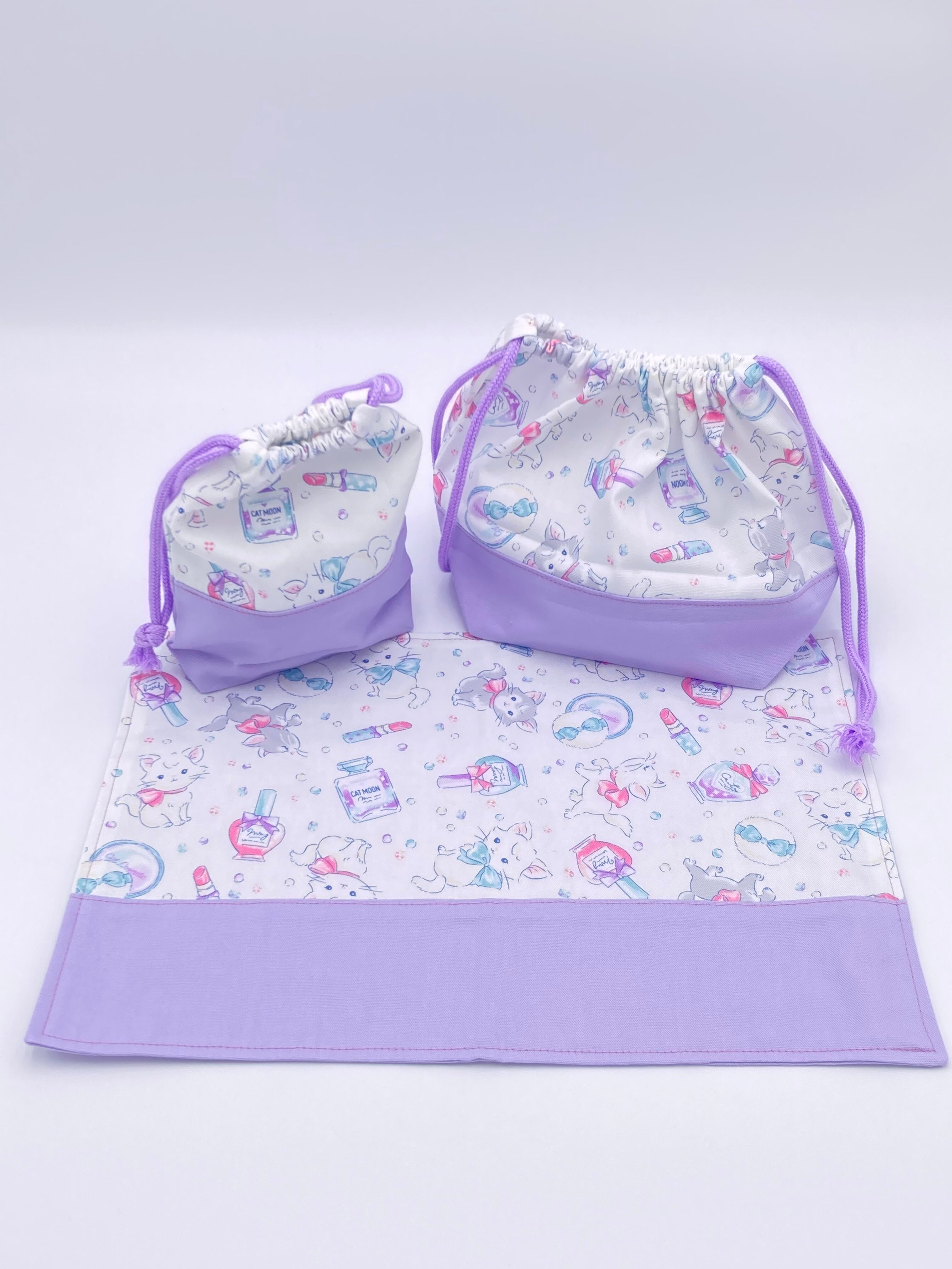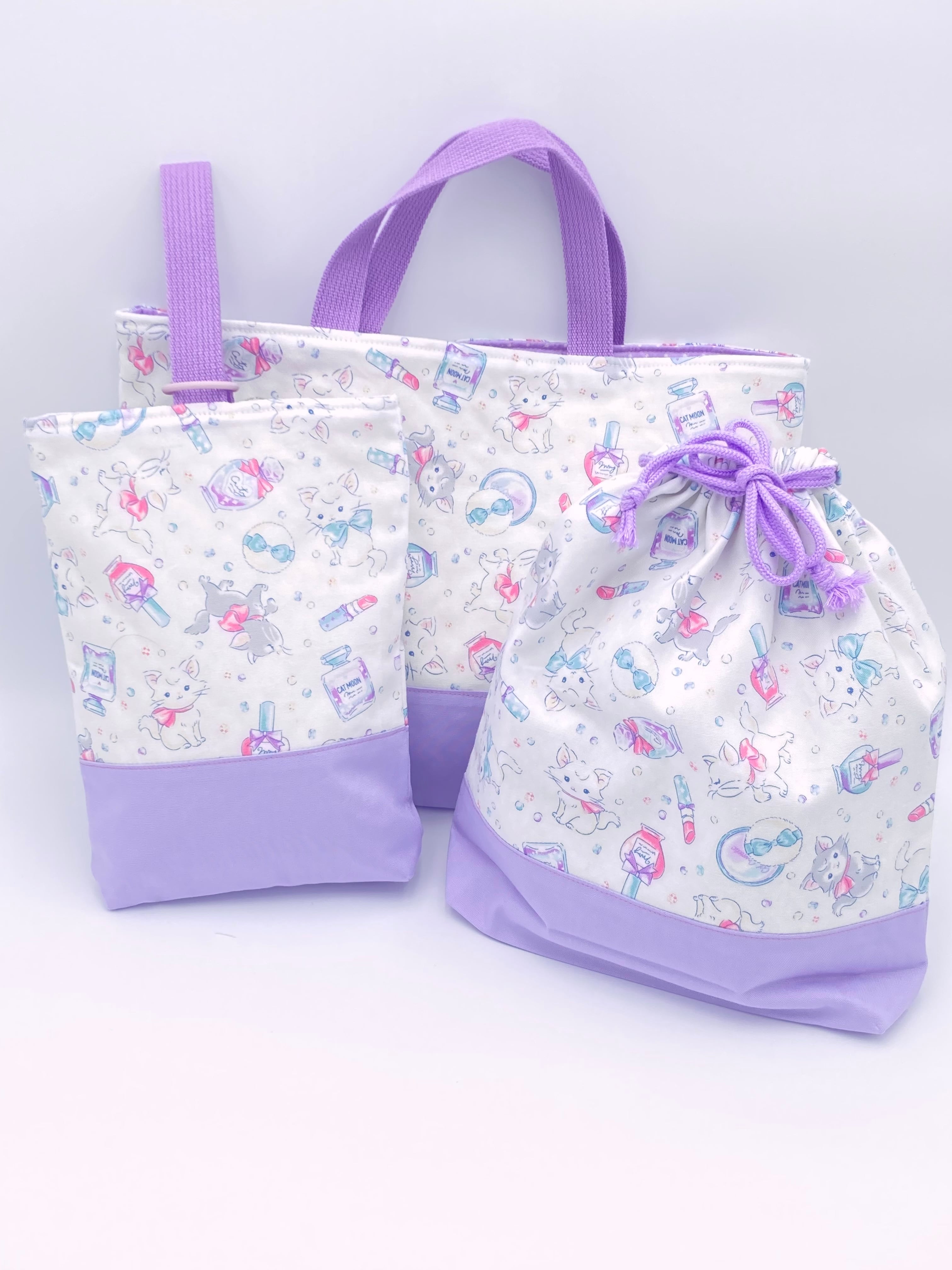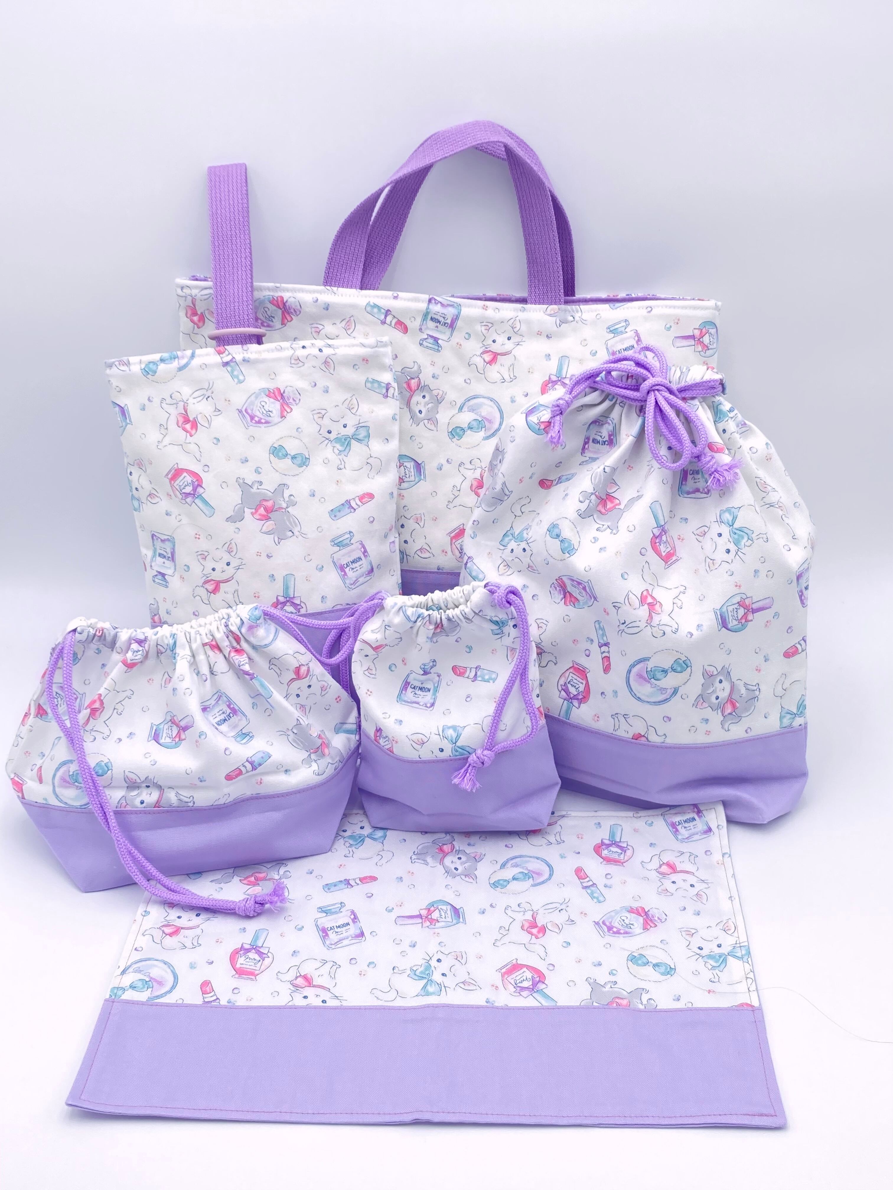 入園グッズ 6点セット レッスンバッグ・シューズバッグ・着替え袋(体操服袋)・弁当袋・コップ袋・ランチマット クラシカルモダンシュシュ キャットコスメ オフホワイト ラベンダー ゆめかわ ゆめかわいい